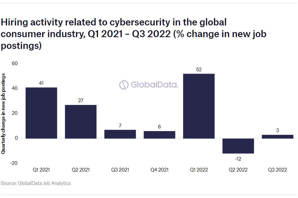Across the consumer goods industry, there was a 3% rise in new job postings related to cybersecurity in Q3 2022 compared with the previous quarter, according to GlobalData’s whitepaper on Cybersecurity in Consumer – Hiring Activity in Q3 2022.