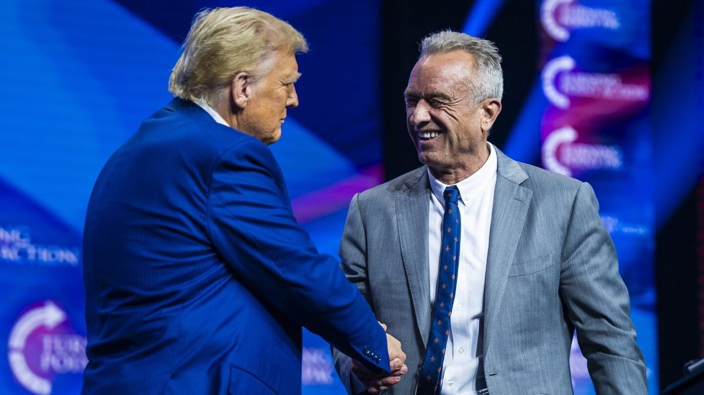 Robert F. Kennedy Jr. speaks with the now President-elect Donald Trump at a Turning Point Action Rally in Duluth, Georgia, on 23 October 2024. Credit: Jabin Botsford / The Washington Post / Getty Images